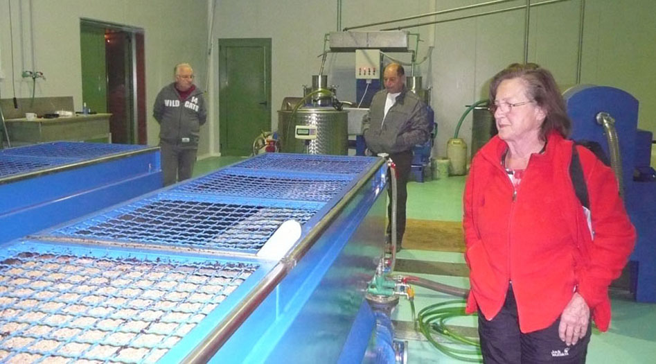 Nachdem die Blätter und Zweige heraus geblasen sind, werden die Oliven gewaschen
